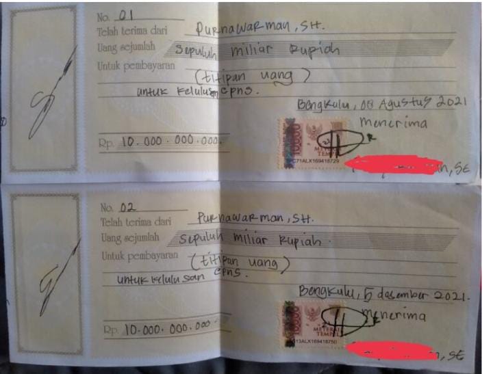 Bengkulu, chyinal.com- Tepat nya di Seluma, salah satu calon bupati periode 2024-2029 diduga sudah menerima uang titipan dalam kelulusan Calon Pegawai Negeri Sipil (CPNS) Berinisial TR (41) Th. TR Menerima uang Sebesar Rp 20.000.000.000 (Dua Puluh Miliyar Rupiah) telah diserahkan langsung dari saudara Purnawarman, sebanyak dua kali, berdasarkan bukti Kwitansi yang didapatkan dari media ini. Tanggal 8 Agustus 2021 Sebesar Rp 10.000.000.000 (Sepuluh Miliyar Rupiah) dan tanggal 5 Desember 2021 Sebesar Rp 10.000.000.000 (Sepuluh Miliyar Rupiah).